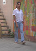 A white linen brought to life with sunflower machine embroidery—fresh, radiant, and cheerful.