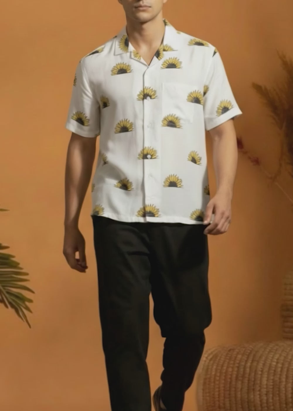 Bright, bold, and unmistakably summer — the Sunflower Pixel shirt brings playful energy to your everyday wardrobe. The all-over sunflower print on a crisp white base makes it an instant conversation starter, whether you're at a rooftop gathering, beach holiday, or weekend brunch.