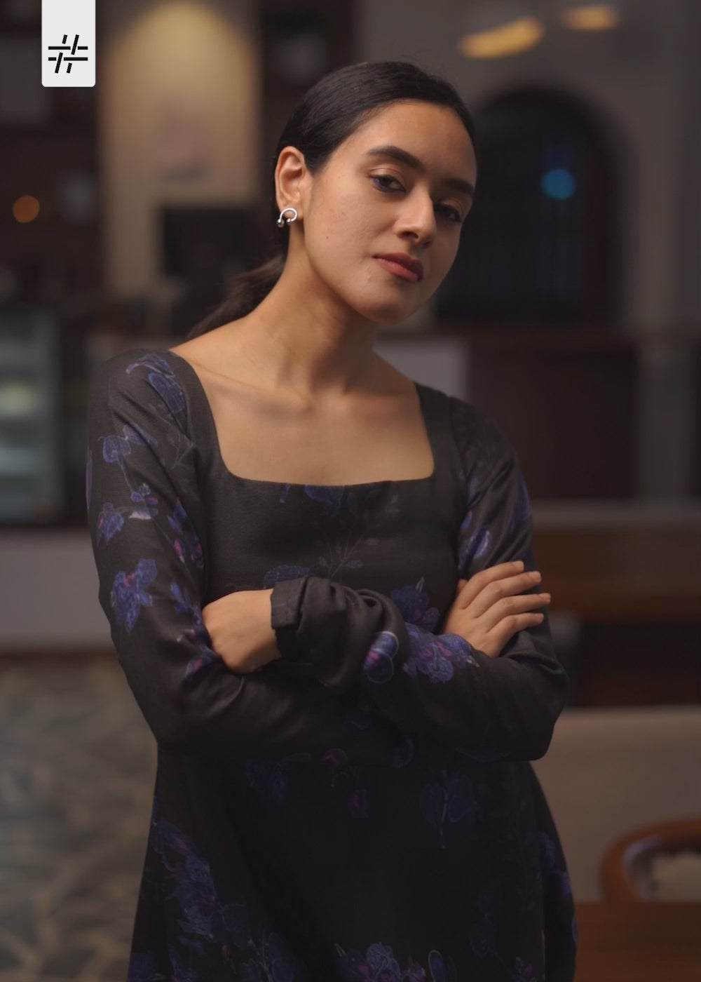 A beautiful black & violet floral print dress featuring wide neck, long churi sleeves, fitted waist and flared hem.