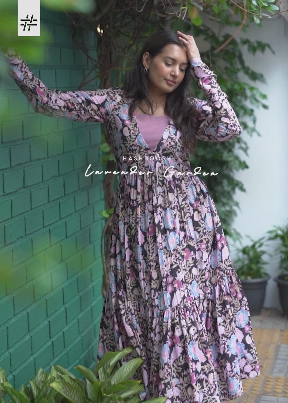 A graceful black, lavender & multicolour floral print dress featuring V neck with lavender cross inner layer, long churi sleeves, fitted waist and flared hem.