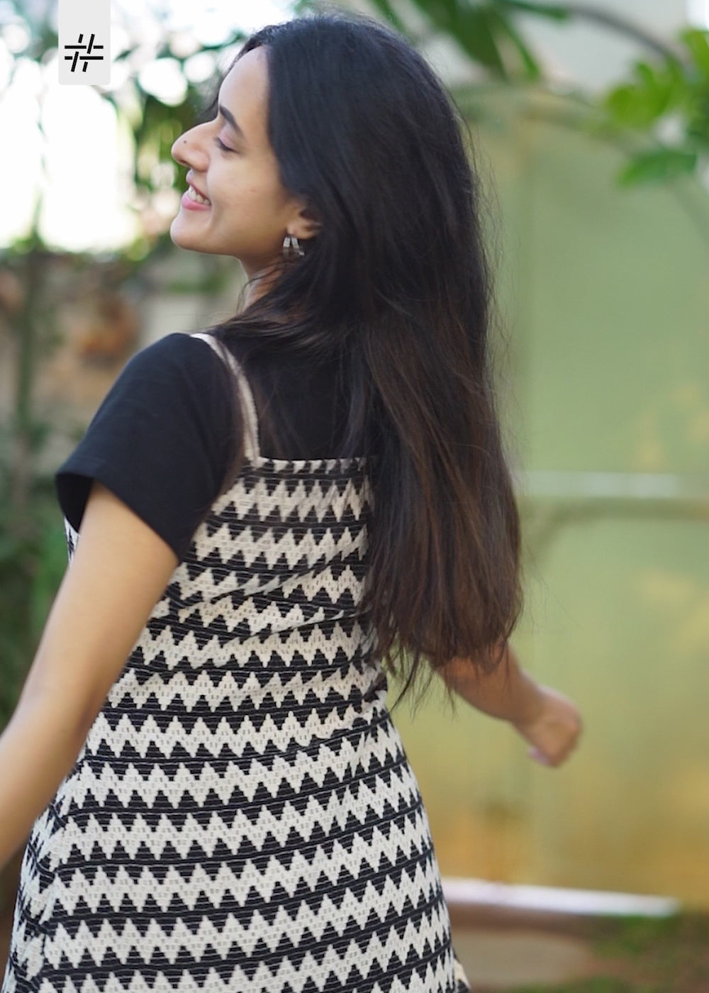 A chic pinafore ensemble featuring a black round neck inner top with short sleeves paired with a black with off white zigzag print sleevless crochet pinafore with wide neck, fitted waist, semi flared hem.