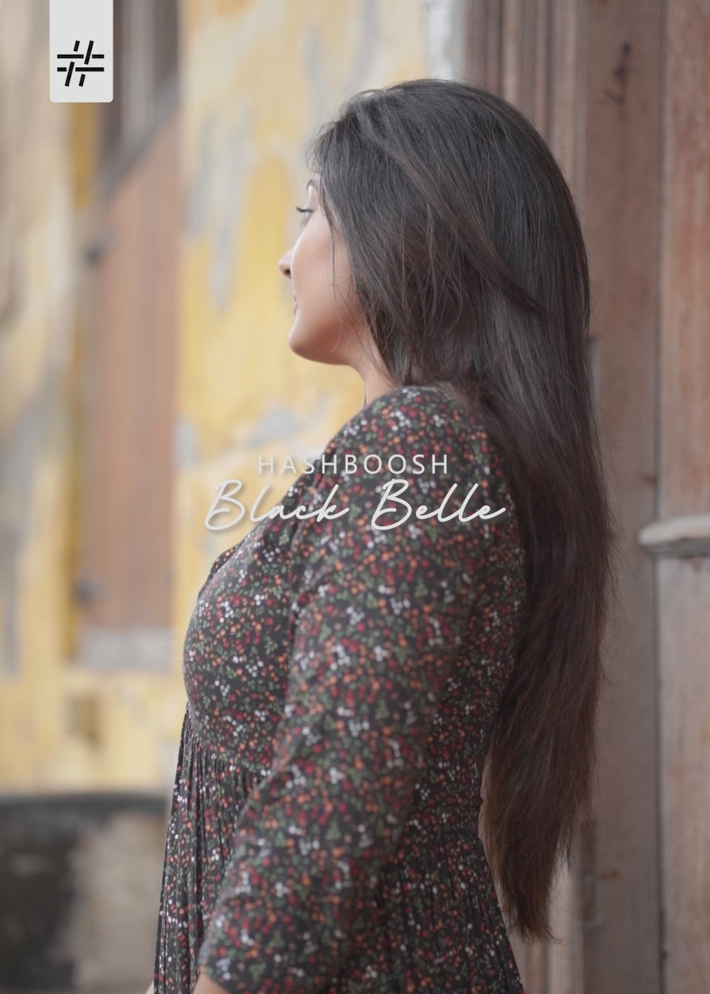 A graceful black, red & multicolour micro floral print dress featuring V neck with a red cross inner layer, three quarter sleeves, straight waist and gathered hem.
