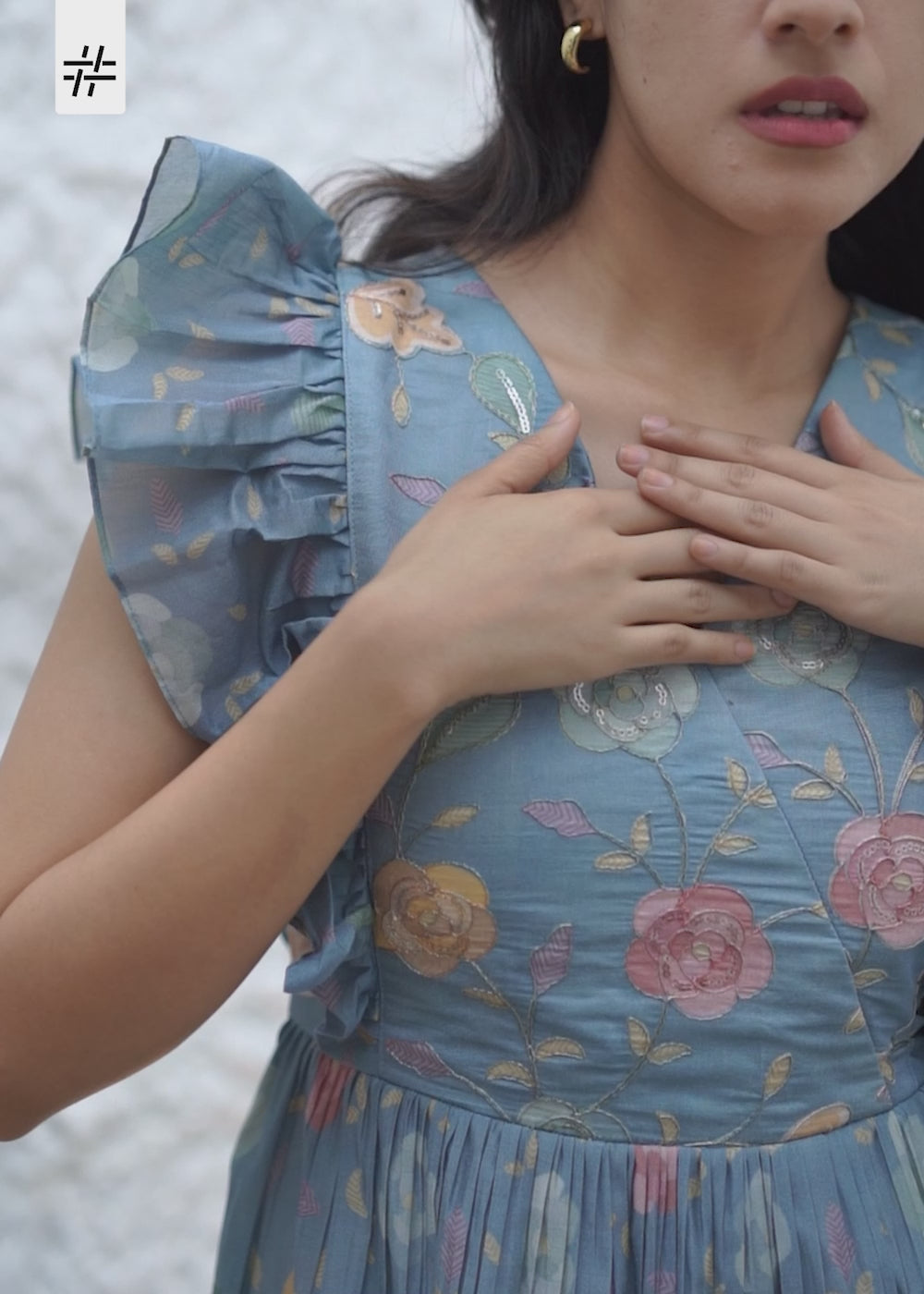 A graceful blue & multicolour floral embroidery chanderi dress featuring V neck, short sleeves with flutter extension, straight waist with pockets and gathered hem.
