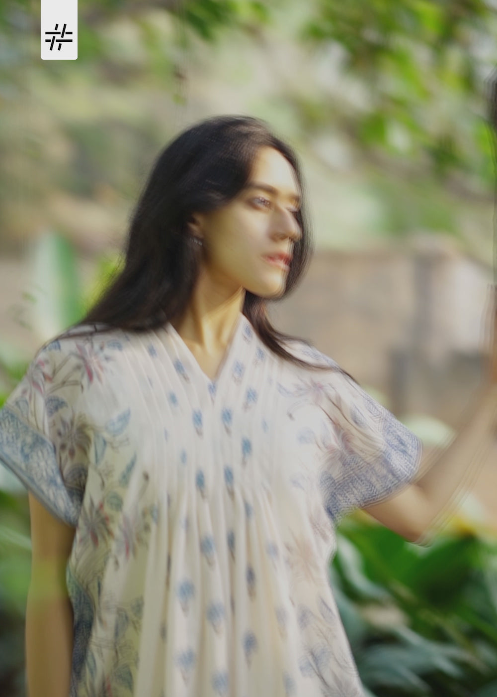 A graceful cream & blue floral print linen kaftan dress featuring V neck with pleated yoke, above elbow direct sleeves, relaxed waist and flared hem.