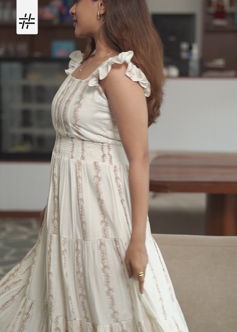A classy cream & golden leafy motif arranged in vertical stripe print dress featuring wide neck, short ruffled sleeves, fitted waist and flared hem.