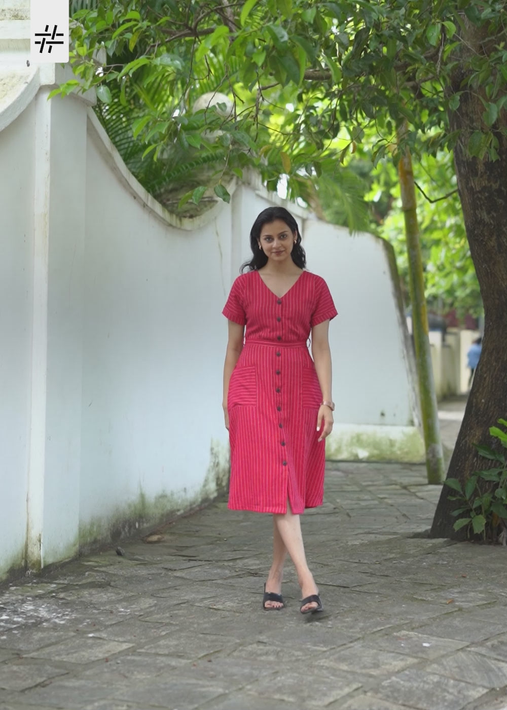 A beautiful dark pink striped dress featuring V neck, above elbow sleeves, fitted waist with tie & pockets, flared hem and button detailing at the front.