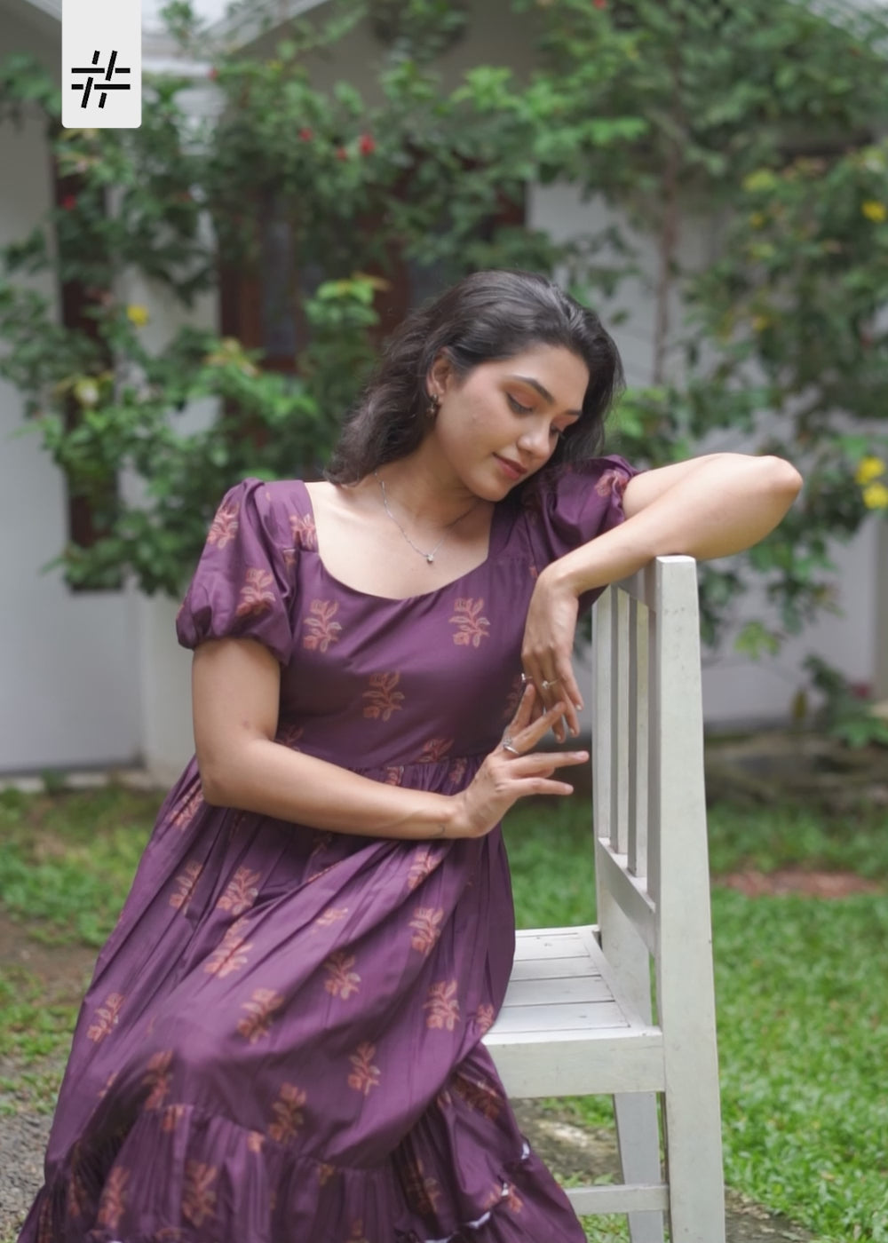 A classy dark purple & multicolour lines and motif print muslin dress featuring square neck, above elbow puffed sleeves, straight waist and gathered hem.