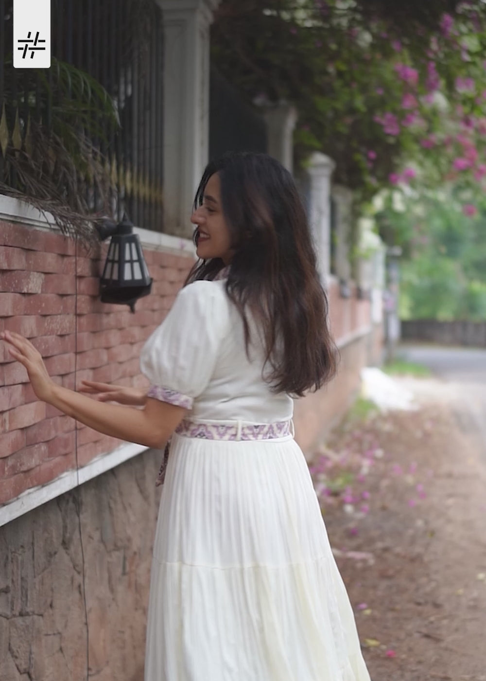 A classy ivory & multicolour ethnic print dress featuring shirt collar neck, elbow length puffed sleeves with ethnic print boarder at the end, straight tie up waist, gathered hem and button detailing at the front.