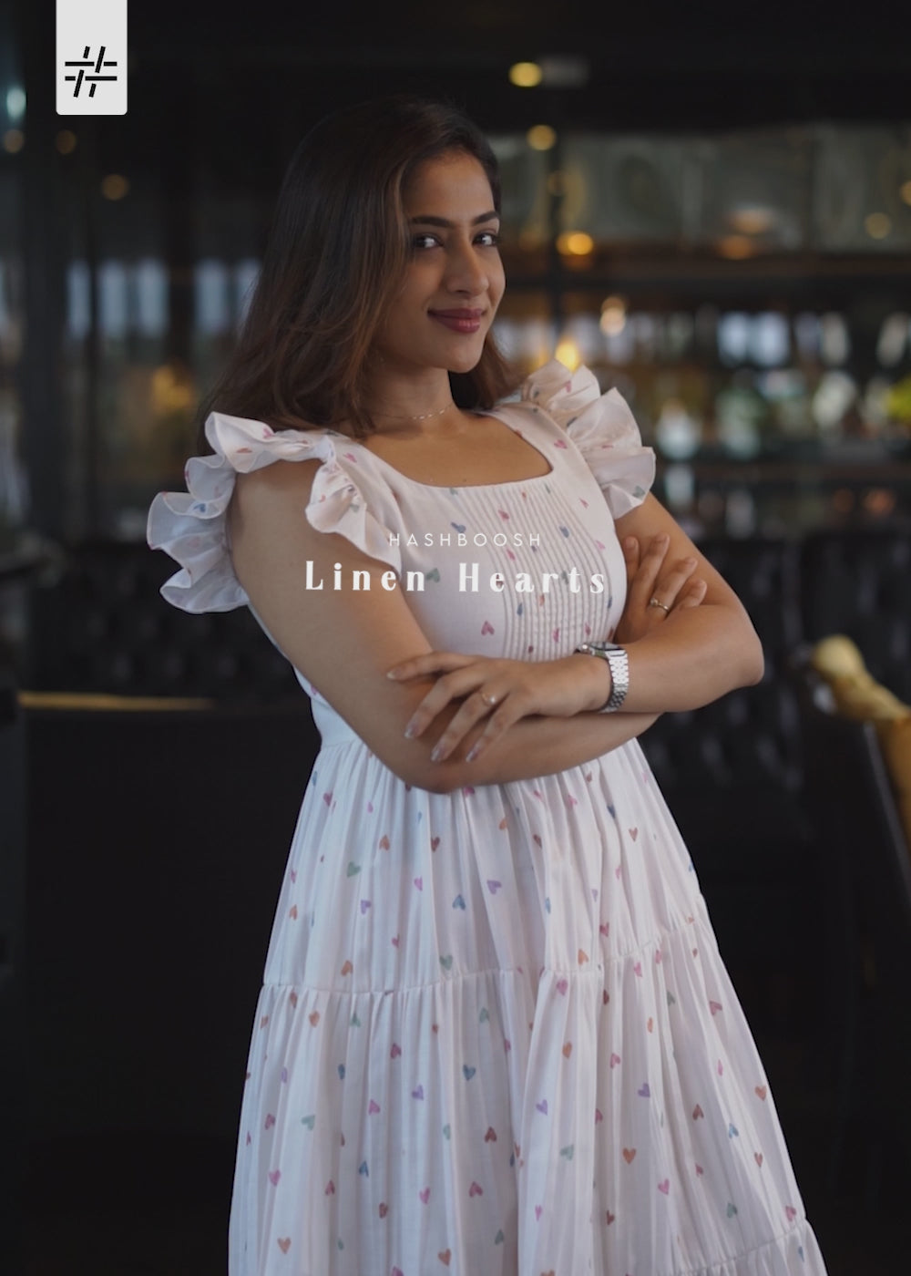 A classy ivory & multicolour hearts print linen dress featuring square neck, pleated yoke, short flutter sleeves, straight waist and gathered hem.