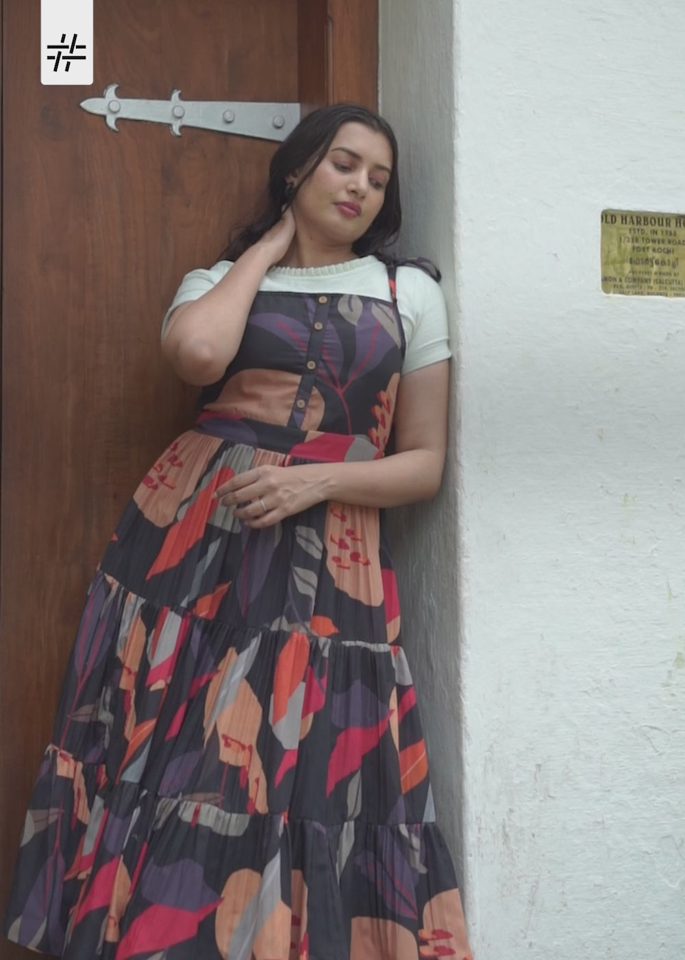 A chic pinafore ensemble featuring a mint gathered round neck inner top with short sleeves paired with a black with multicolour abstract print square neck pinafore with tie up shoulder straps, fitted waist, flared hem and button detailing at the front.