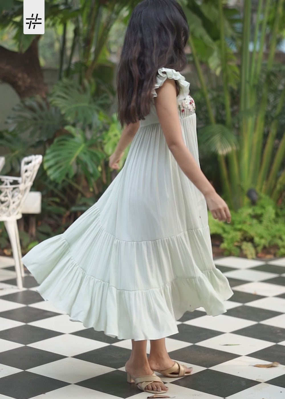 A graceful mind green dress featuring wide neck with multicolour floral hand embroidery yoke, short flutter sleeves, fitted waist and flared hem.