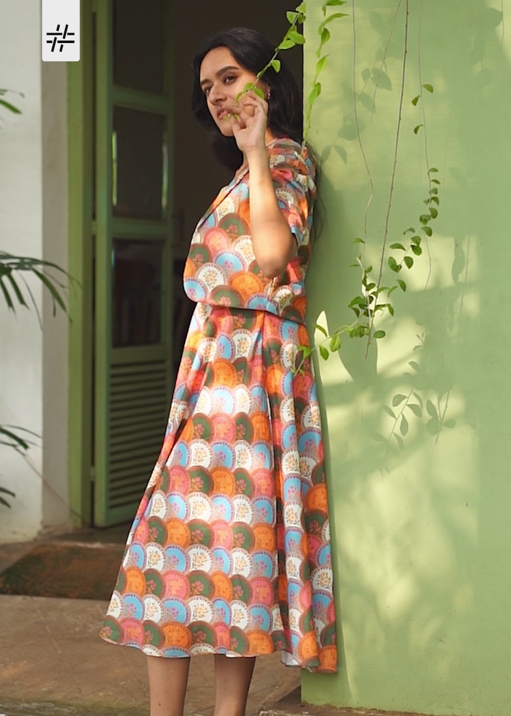 A beautiful shrug dress ensemble featuring multicolour & beige. It has a floral & scallop geometric print sleeveless jute mix inner dress with square neck, fitted waist and a flared hem, paired with a multicolour coat collar shrug with elbow length puffed & pulled sleeves. The shrug matches the hem of the inner dress.