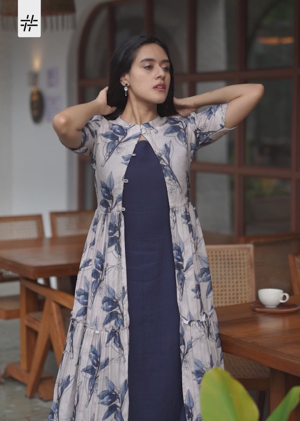 A grand shrug dress ensemble featuring a cream & blue, black floral print print mandarin collar linen shrug with elbow length puffed & pulled sleeves, straight waist, gathered hem and button detailing at the front., paired with a long navy blue sleeveless inner dress with square neck and semi flared hem.