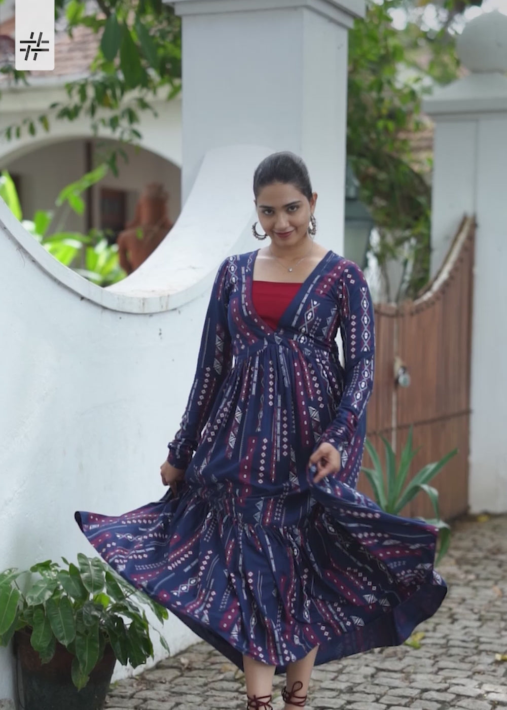 A graceful navy blue geometric print dress featuring V neck with red cross inner layer, long churi sleeves, fitted waist and gathered hem.
