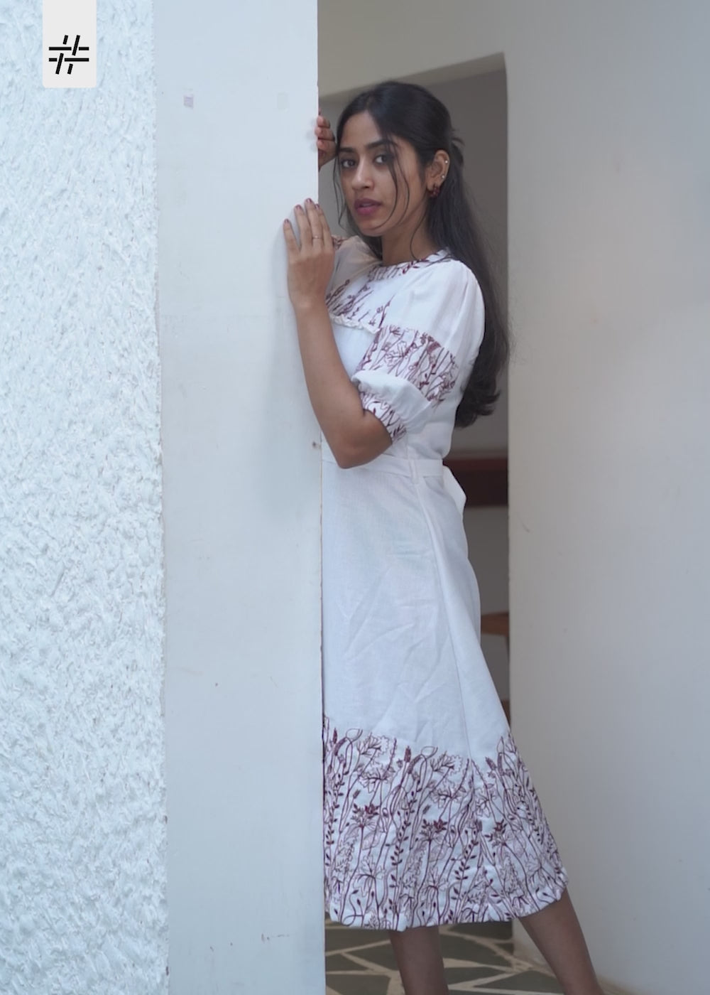 A beautiful off white with red floral machine embroidery print linen dress featuring a stand collar neck, puffed sleeves with embroidery detailing & embroidery border at the end, fitted waist with tie and flared hem.