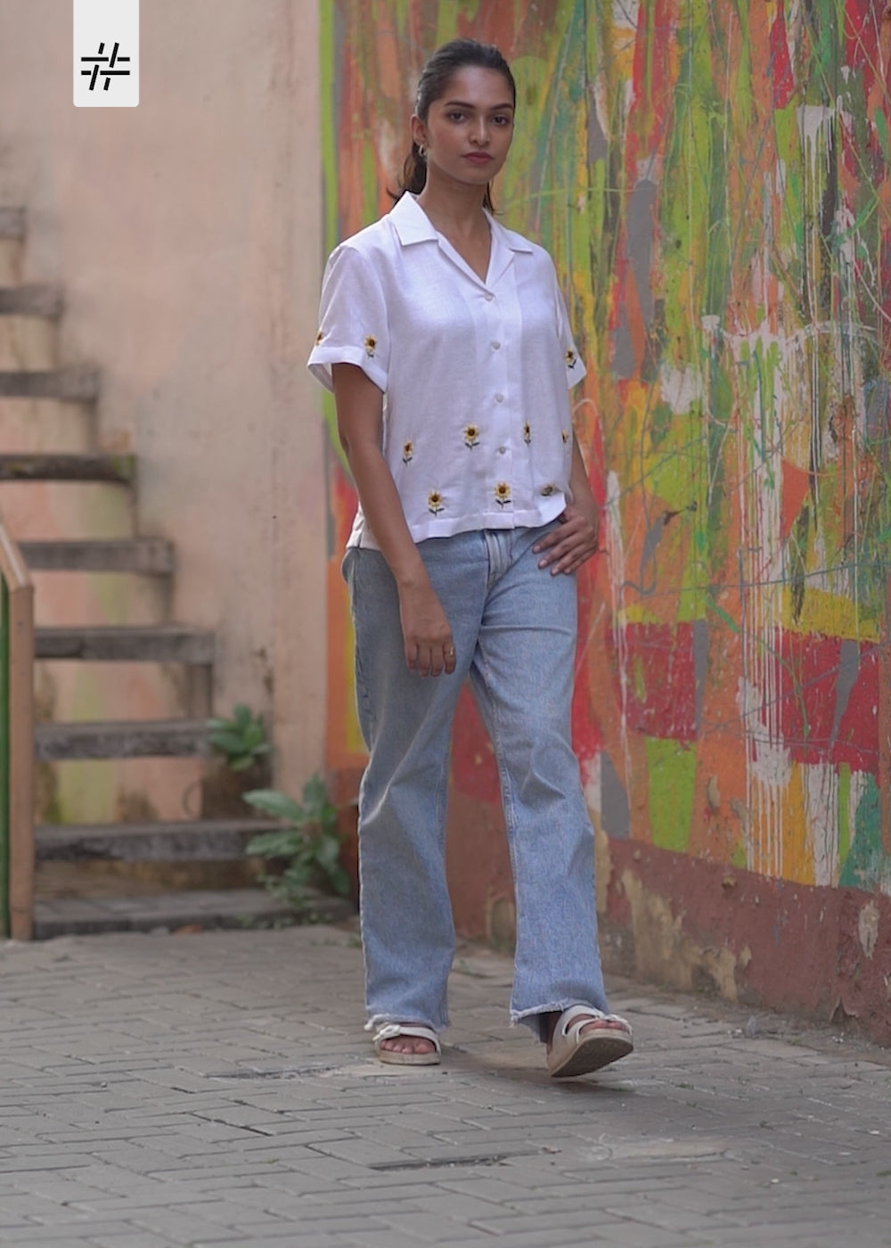 A relaxed-fit off white & yellow floral (sunflower) machine embroidery shirt, featuring a cuban collar with above elbow sleeves and straight hem—low effort, high impact, made to move with you.