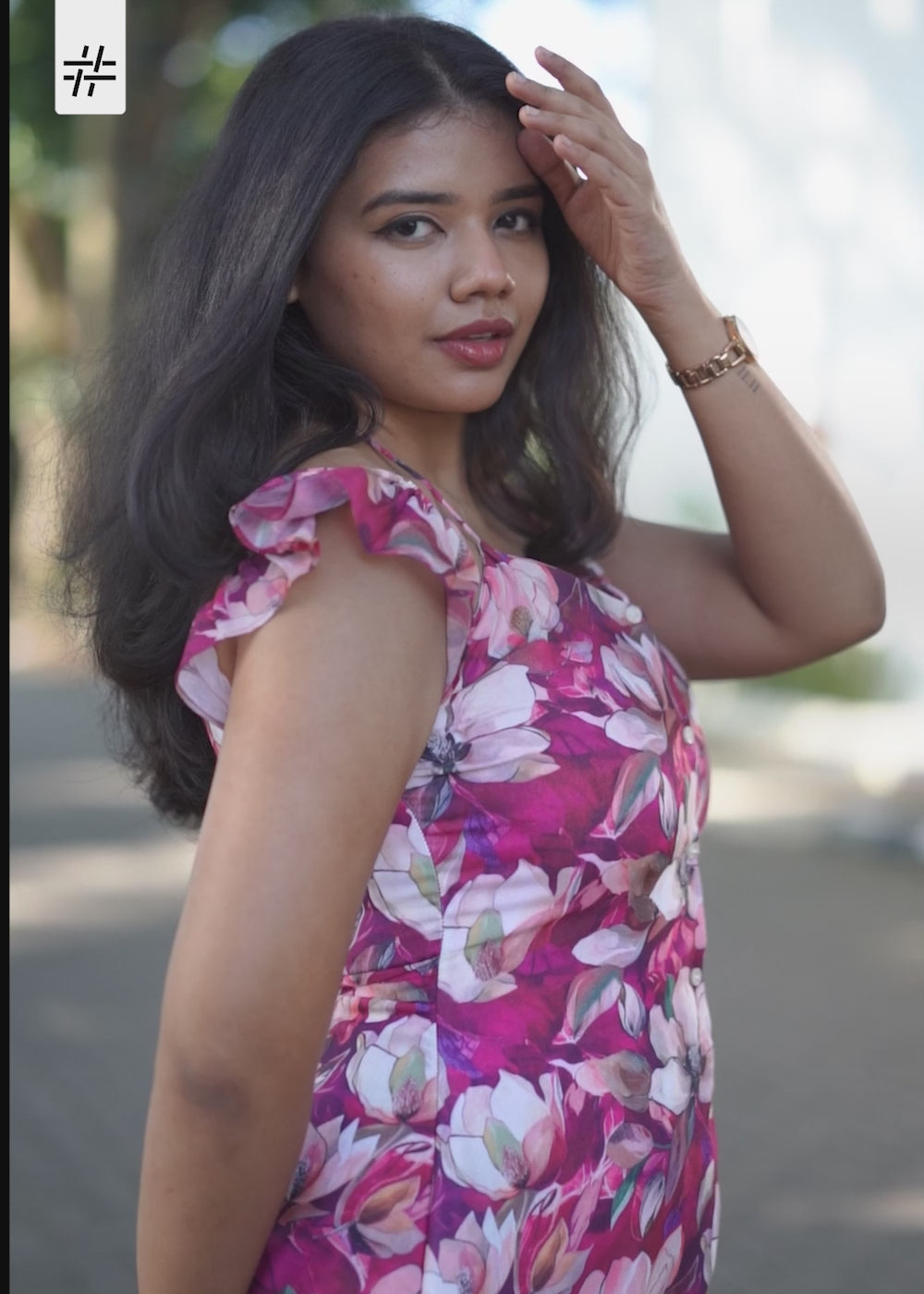A beautiful pink & multicolour floral print dress featuring a sweetheart neck with tie, short flutter sleeves, straight waist, gathered & tiered hem and button detailing at the front.