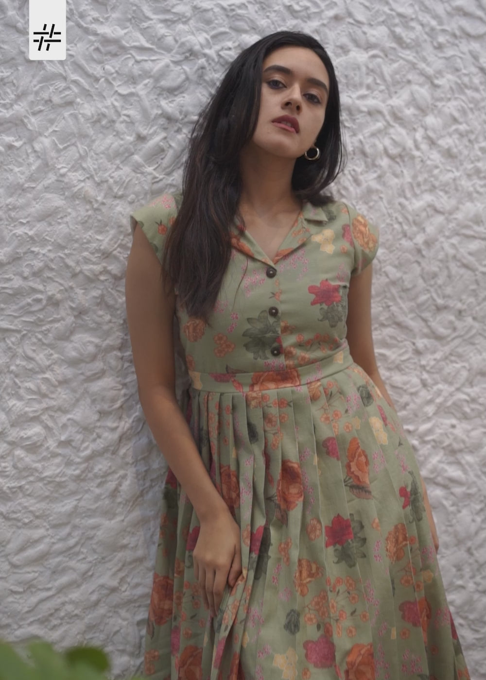 A graceful sage green & multicolour floral print linen dress featuring coat collar neck, short sleeves, fitted waist, flared hem and button detailing at the front.