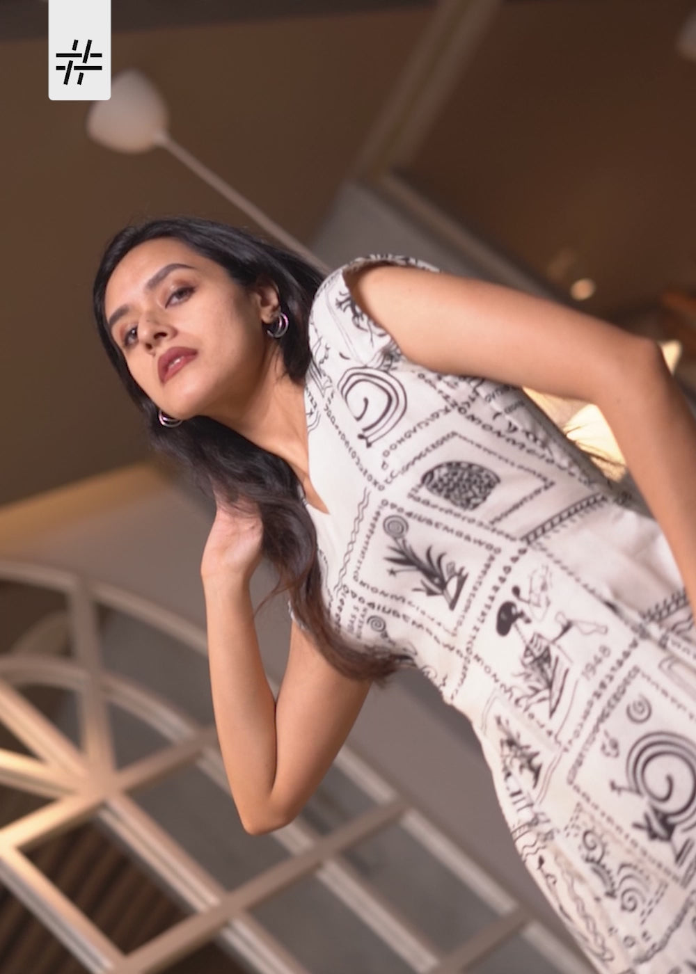 A classy white & black graphic print linen dress featuring V neck, short cap sleeves, straight waist and semi flared hem.